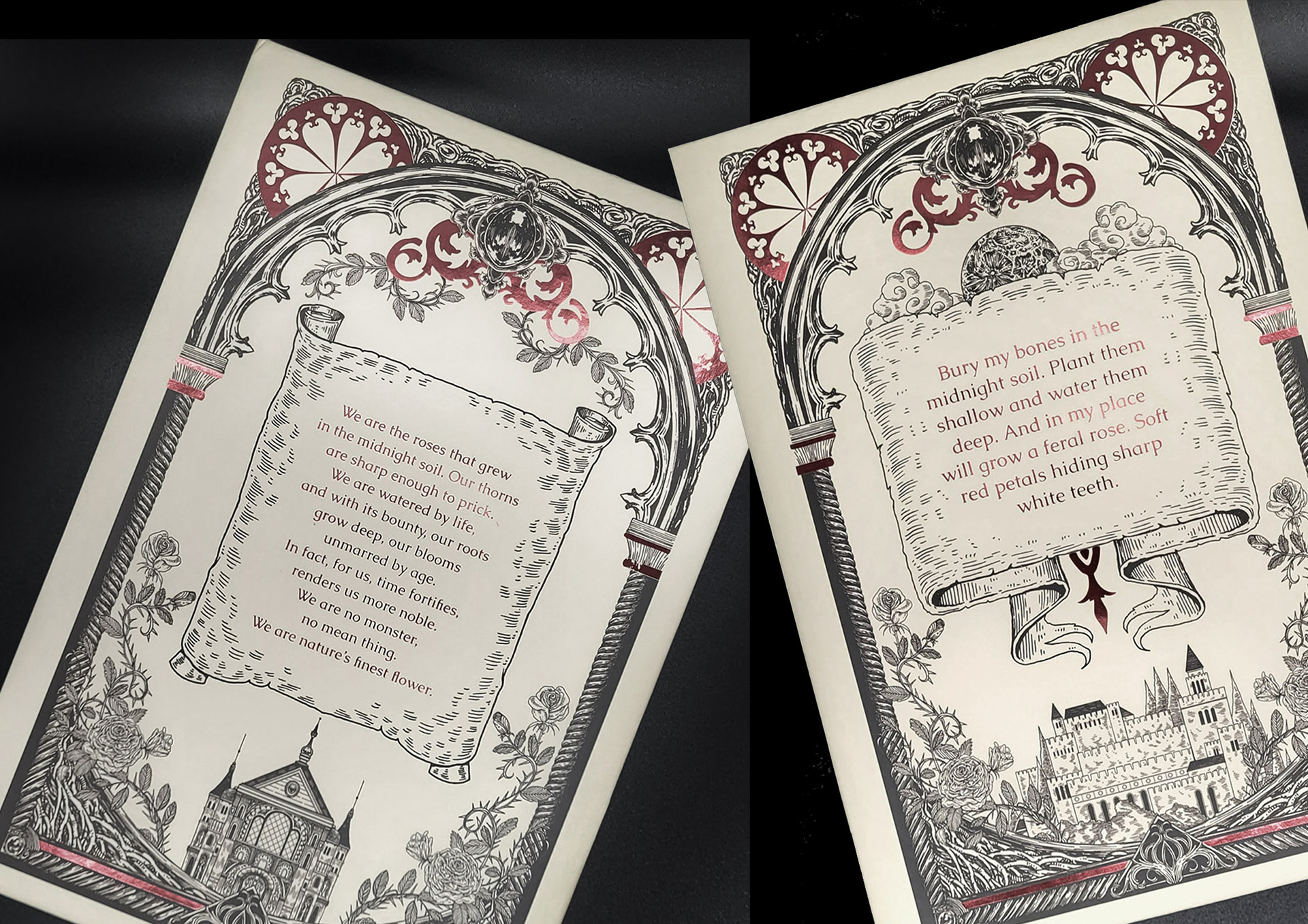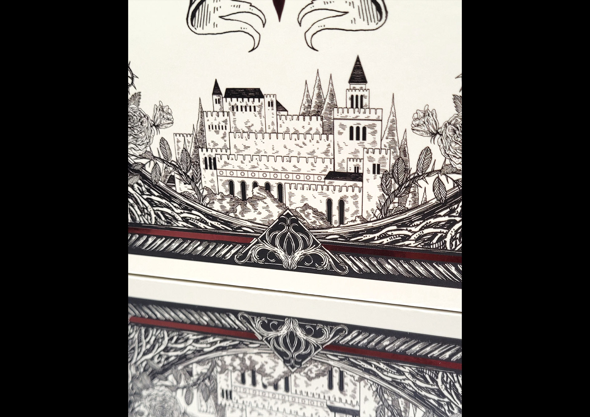 It was fun to draw the architecture, and I also enjoyed designing the Gothic style frame. I’m glad the red foiling turned out even better than I expected.